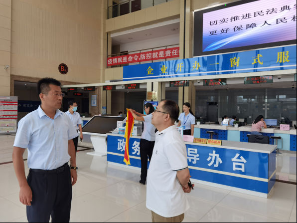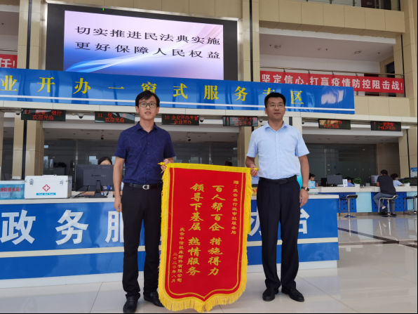 人民法治网讯(润雪) 8月14日上午,在山东省庆云县投资建厂的王经理来到庆云县政务服务中心,将一面锦旗送到庆云县行政审批服务局王志广局长手中。