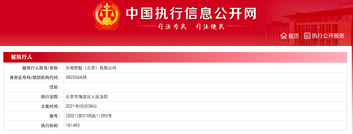 乐视控股(北京)有限公司成被执行人 执行标的181495元