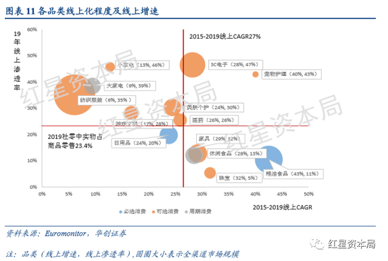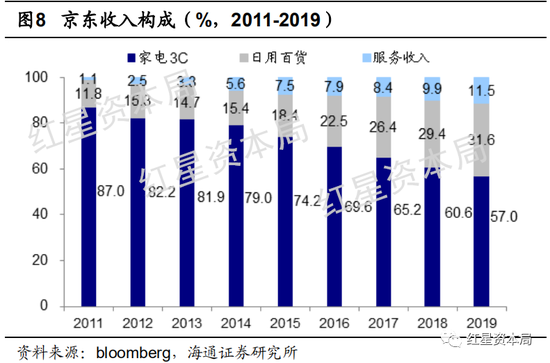 具体以京东为例:2011年,京东的收入构成中家电3C占87%。京东以家电3C起家,通过家电3C给用户建立了稳定的购买联想。随后,京东通过物流优势以及“PLUS”等活动建立消费者粘性,开始向外部产品拓展。到2019年,其家电3C占比为67.0%,而日用百货收入占比上升至31.6%,开始稳步向多品类布局。