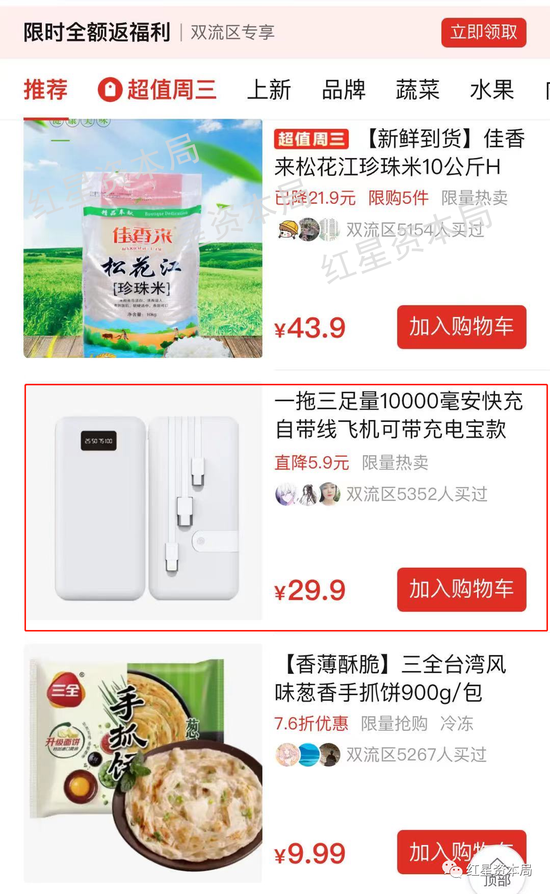 首先,一打开拼多多的首页,gaoguan就可以收到多多买菜的弹窗提醒,每一个用户点开APP都会被触达一次;其次打开拼多多主页,多多买菜入口就放在主页最中间,占据绝对C位的多多买菜,可谓非常醒目。