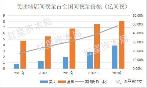 所谓“一日三餐”,餐饮外卖的频率最高,酒旅可归属于“季频和年频”业务,频率较低。美团通过高频的餐饮外卖业务给低频的酒旅业务引流,使得酒旅业务得到了快速发展,逐渐超过酒旅老牌巨头携程系。2018年美团酒店间夜量超过携程系,2019年美团酒店间夜量更是已经接近我国全年总间夜量的一半。